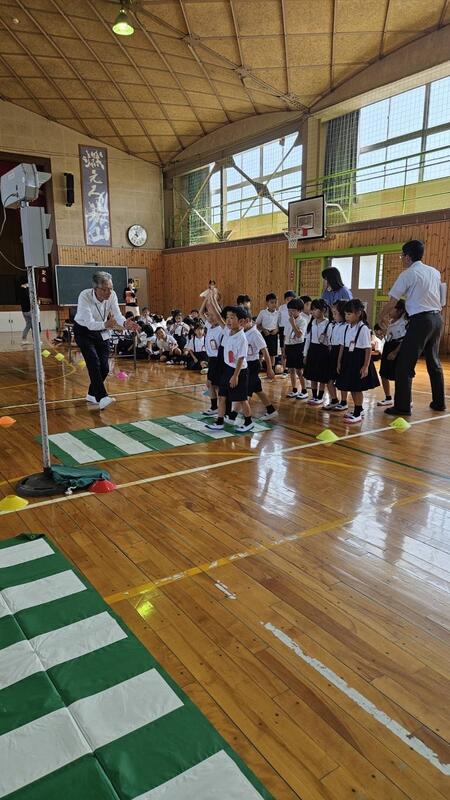 体育館で、1年生が交通教室を行いました。横断歩道の渡り方を中心に、安全確認の仕方など交通指導員や市役所の方から手ほどきを受けていました。