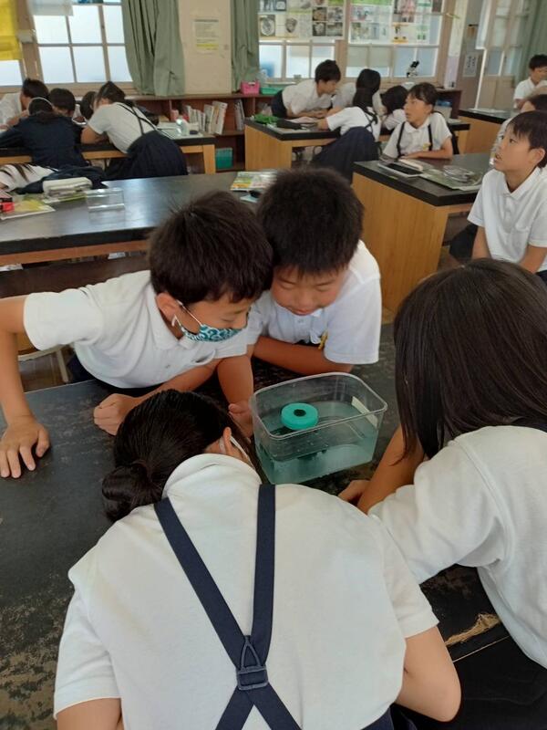 この入れ物に入っている生き物はメダカです。5年生の理科で学習するのですが、メダカのことに詳しい田上さんが、子供たちのためにオスとメズの見分け方など教えてくださいました。
