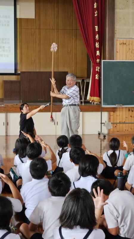 今回は地域の吉永さんにおいでいただき、実際に目の前で棒を回すデモンストレーションも披露!子供たちも拍手喝采でした!
