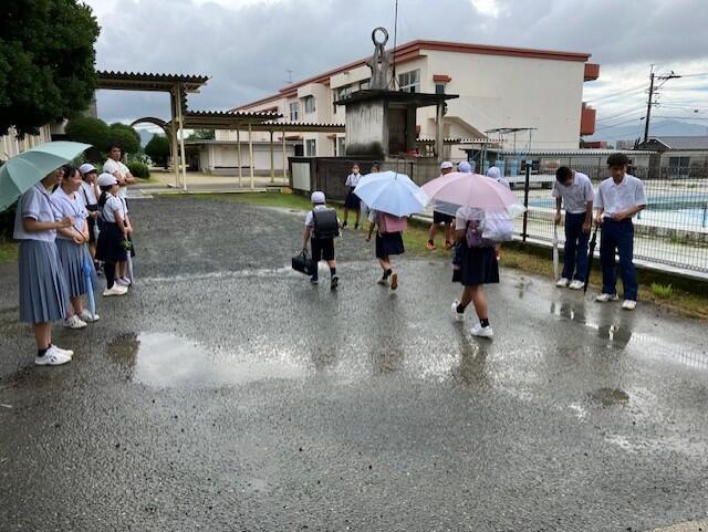 あいにくの小雨状態でしたが、玉名中学校の生徒さん(卒業生)と本校企画委員会の子供たちによる合同あいさつ運動が行われました。