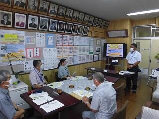 今日は、オンライン集会で、清掃美化委員会とふれあい音楽委員会の発表がありました。写真は、発表を聞いている1年生と発表している様子です。1年生は、静かに聞くことができていました。