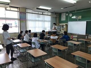 6月30日(木)義務教育課主催で、築山小学校を会場にして外国語の授業づくり研修が行われました。授業後18名の先生方の参加で、授業研究会が行われました。写真は、授業の冒頭の部分です。