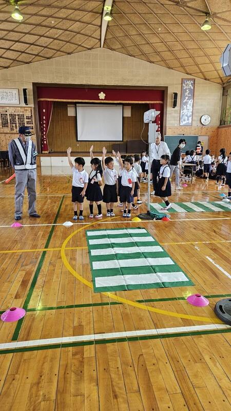 体育館で、1年生が交通教室を行いました。横断歩道の渡り方を中心に、安全確認の仕方など交通指導員や市役所の方から手ほどきを受けていました。