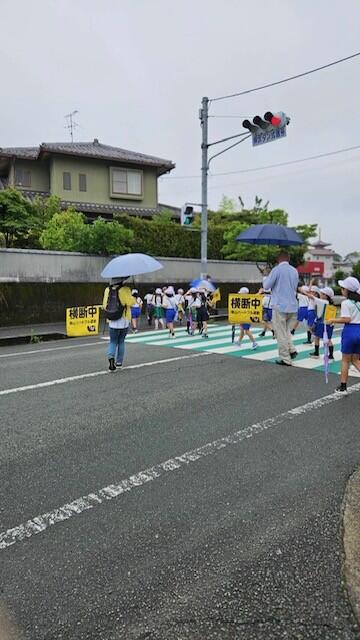 ボランティアの方々の協力もあって、3,5年生は自転車の乗り方(実際に歩道や信号を渡る)、2年生は横断歩道の歩き方などを実際に道路を使って行いました。(あらかじめ玉名警察署にも使用許可は取ってあります)