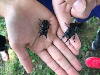 今日の昼休みの様子です。築山小運動場の奥に小さな林があります。そこに子供達が集まっていました。近づいてみると、クワガタをとっていました。今日は、3匹いたようです。その林の周辺では、1年生が大勢遊んでいました。
