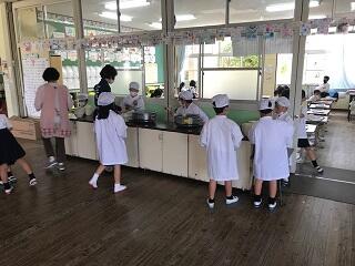 1年生の給食準備の様子です。最近は、子供達が配膳をしていますが、今日は、準備開始が遅れたので、先生方がお手伝いをされていました。他の2枚の写真は、準備の後、おかずの量の調節をしているところと、準備を終えたところの写真です。