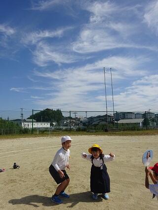 なかよし6組の児童は、国語の物語「くじらぐも」で学習したことをもとに、運動場で実際に動作化を行いました。友達と手をつなぎ、ひざを曲げ、青空にうかぶクジラ雲にとどくよう一緒にジャンプしました。とても清々しい気持ちになりました。