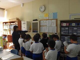 朝活動の時間に3年生が1年生教室に来て、絵本の読み聞かせを行いました。3年生は国語「班で意見をまとめよう」の学習で、1年生への読み書かせの内容や時間等について話し合い、実施につながりました。1年生も楽しそうな表情で、読み聞かせを聞いていました。