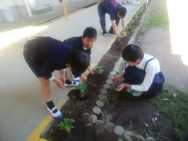 4月28日(金)5年生が、上の運動場のまわりの花壇にマリーゴールドの苗を植えました。