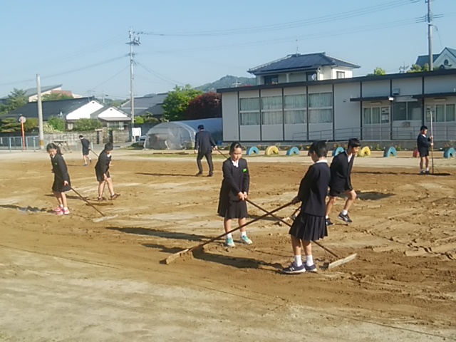 4月28日(金)上の運動場を雨の日に駐車場に使い、タイヤの型がついていたので、6年生がきれいに整備をしていました。