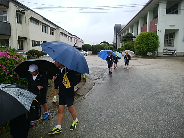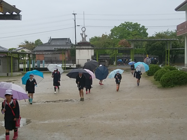 4月26日(水)久しぶりの雨の中の登校です。傘の花が開いています。