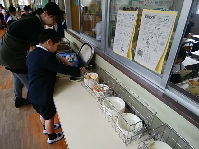 4月20日(木)1年生も給食になれてきました。片付けも丁寧にできています。