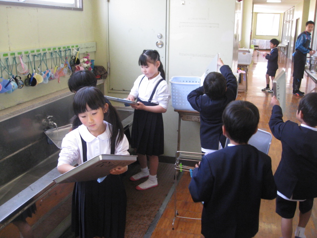 4月13日(木)1年生も給食を食べたら、食器を片付けて、おぼんは自分で洗ってきれいに拭いています。