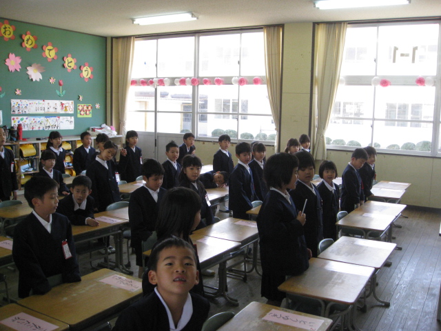4月13日(木)朝の会で、1年生が明日の1年生を迎える会の自己紹介の練習をしていました。
