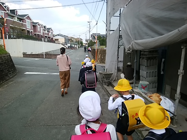 4月26日(水)家庭訪問中で、早く帰ります。地区の6年生が1年生のお世話をしながら帰っています。