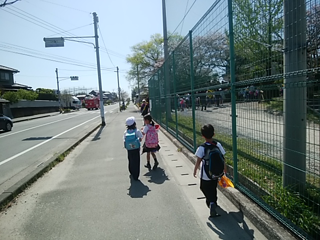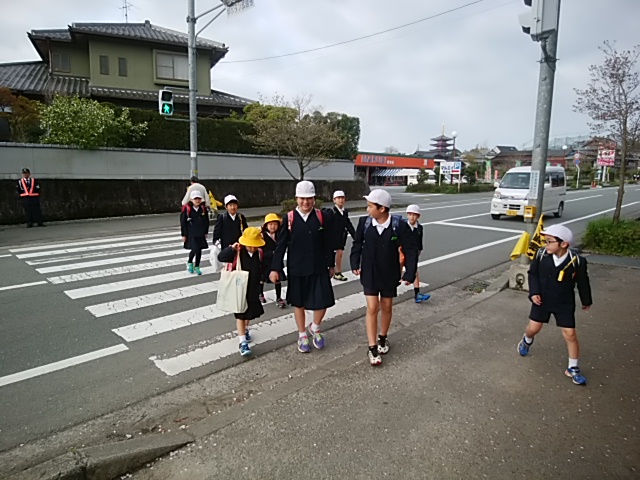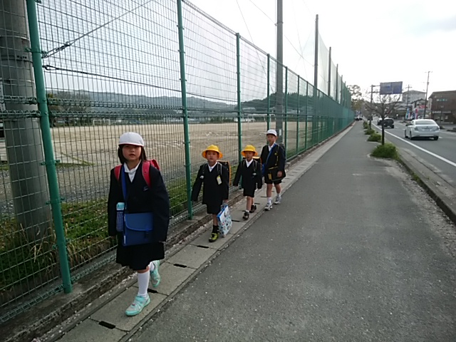 4月12日(水)今日から登校班が揃って登校しています。班長が手を引いたり、一列で並んで登校したり、よくできていました。