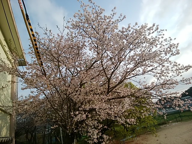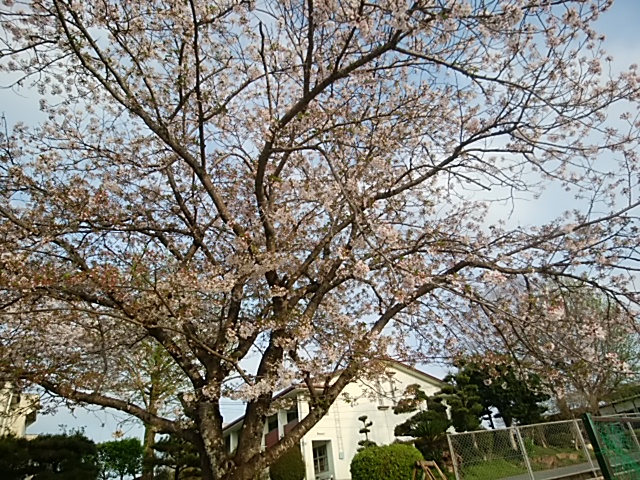 4月12日(水)校門前の桜はどんどん散っていて、葉が出てきています。プレハブ後ろは今が満開です。