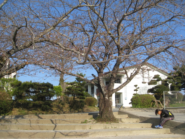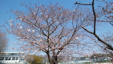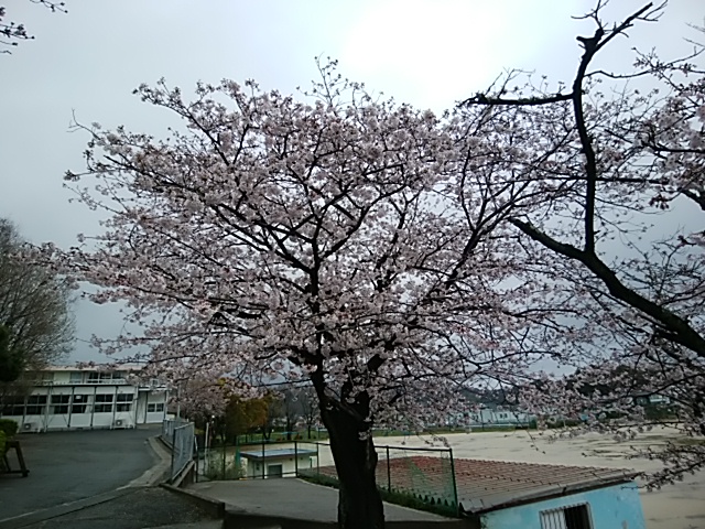 4月3日(月) 築山小の桜の木がやっと開花し始めました。まだ、1分咲きぐらいですが、今週は暖かいようなので、数日中には満開になりそうです。