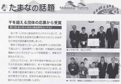 4月4日(火)広報たまなに築山小のことが載りました。第11回日本赤十字命と献血俳句コンテスト団体賞の表彰の様子が紹介されました。