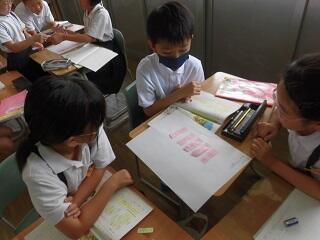 築山小学校では「学び合い学習」を積極的に行っており、全学級で指示棒を使っての全体発表や、付箋に書いた考えをグループでシートに貼り付け伝え合う学習などを行っておきます。