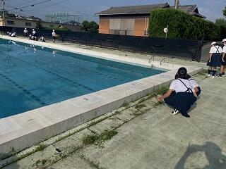 本日、朝から体育委員会の児童と5年生のボランティアがプールサイドに集まり、草取りをしてくれました。プールサイドの草が少なくなったことで、気持ちよく水泳の学習ができると思います。