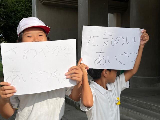 朝の中庭では、企画委員会(児童会役員)の子供たちが、手づくりポスターを手にして「あいさつ運動」に取り組んでくれていました。