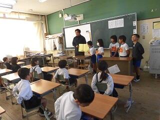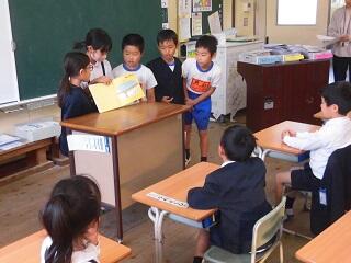 朝活動の時間に3年生が1年生教室に来て、絵本の読み聞かせを行いました。3年生は国語「班で意見をまとめよう」の学習で、1年生への読み書かせの内容や時間等について話し合い、実施につながりました。1年生も楽しそうな表情で、読み聞かせを聞いていました。