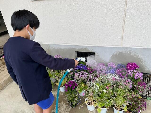 また、こちらは委員会活動としての取組ですが、玄関前のプランターや植木鉢への水かけと花ガラ集めを頑張っている子供たちがいました。