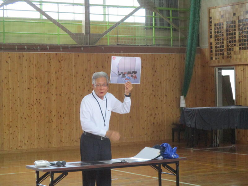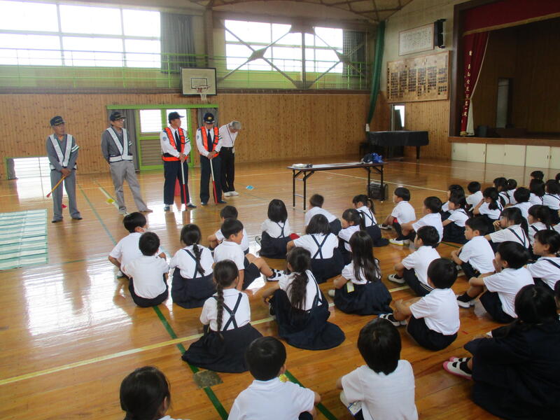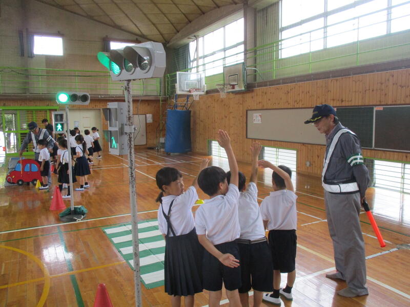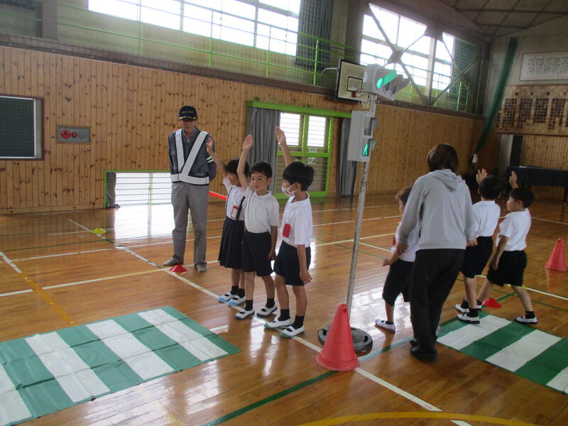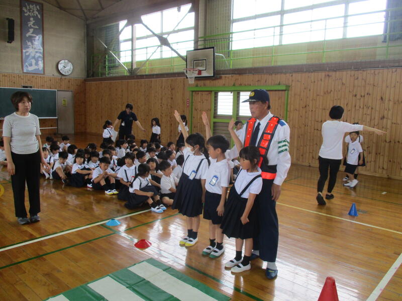 6月2日(月)1年生の交通安全教室が行われました。まず、交通指導員の方からお話がありました。自分の命を守るために大事なことを話していただき、横断歩道を渡るときの大切な約束「1・2・3・4・レッツゴー」を教えていただきました。