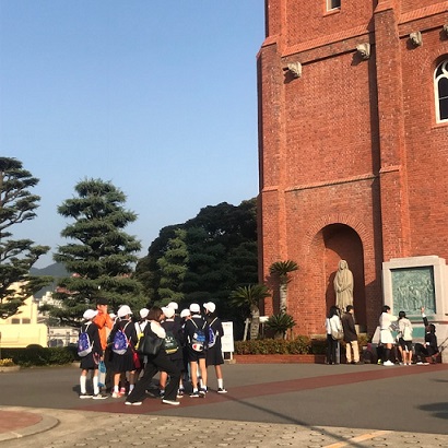 <フィールドワーク>グループ毎にボランティアガイドさんについて、如己堂や爆心地などで学習していました。