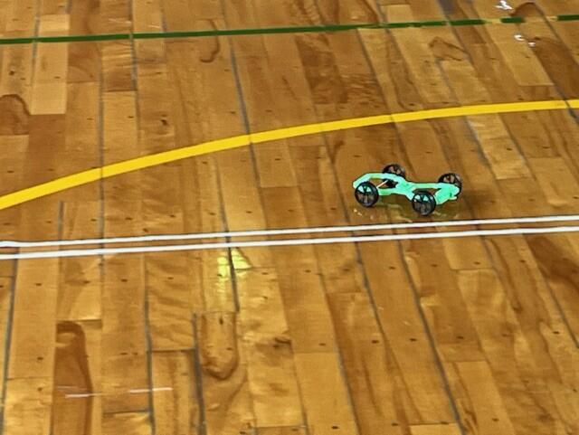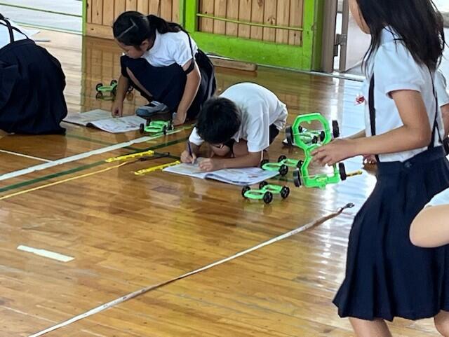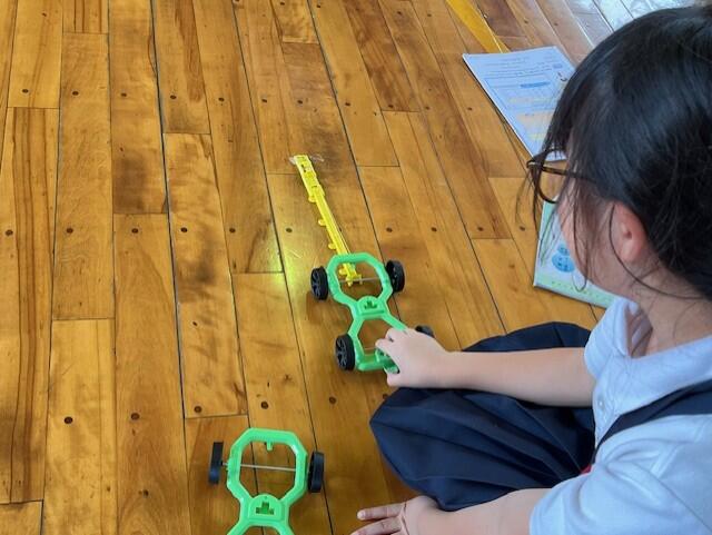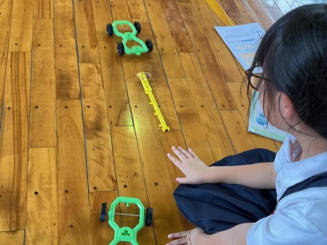 理科の授業の実験のようでした。車の模型に輪ゴムをひっかけて、どこまで進むのかを実験していたようです。