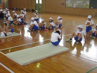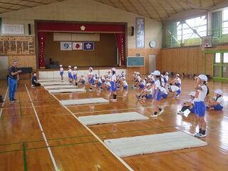 3年生では体育の授業にマット運動を頑張っています。安全に気をつけながら開脚前転や後転など手のひらのつき方を工夫し、背中を丸めながら上手にできるよう繰り返し練習していました。