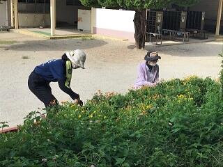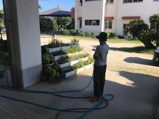 夏休み中は、職員が花壇のお世話をしています。学校園(朝夕に水かけ)は当番の先生、学級園は、学年部で担当しています。写真は、水かけと除草をしているようすです。