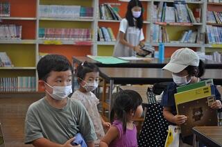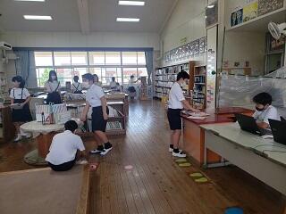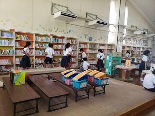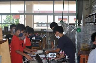 夏休み中は、期日を決めて図書の貸し出しを実施しています。図書室補助員の古城先生と図書委員のみんながお世話をしてくれています。写真は、その様子です。
