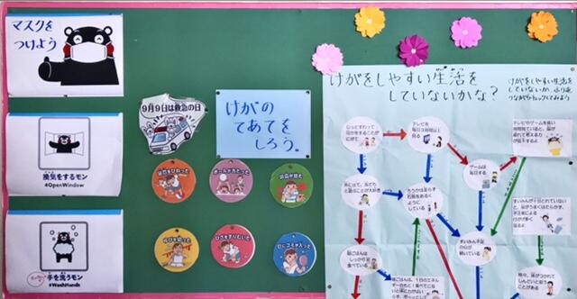 保健室前の掲示物が、夏休み明けの教育活動に向けてリニューアルいたしました。テーマは、感染防止とけが防止です。紹介します。※右側の表が見にくいので、下に拡大しています。