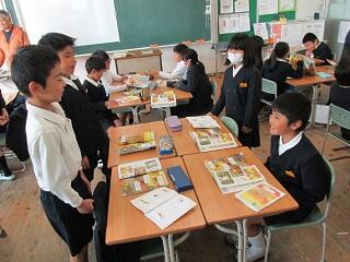 本日、5年生では外国語科の授業で自分のめざすヒーロー、ヒロインについて英語での発表会が行われました。スクリーンに自分のヒーロー等の写真や特徴などを表示し、全員が上手に発表できました。