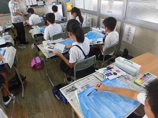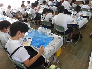 5年生は読書感想画に向けて図画工作科の学習を頑張っています。背景の星空を描くために青を基調として、筆遣いや色の濃淡を工夫しながら個性あふれる作品を作っていました。