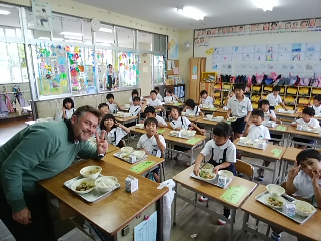 6月21日(水)ALTのジェームス先生が来校し、英語の授業がありました。給食は1年生と一緒に食べました。