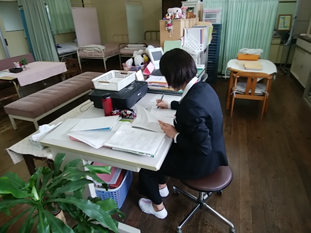 6月13日(火)養護教諭を目指して教育実習生が3週間の予定で来ています。保健室で事例等の研究をしていました。築山小出身です。