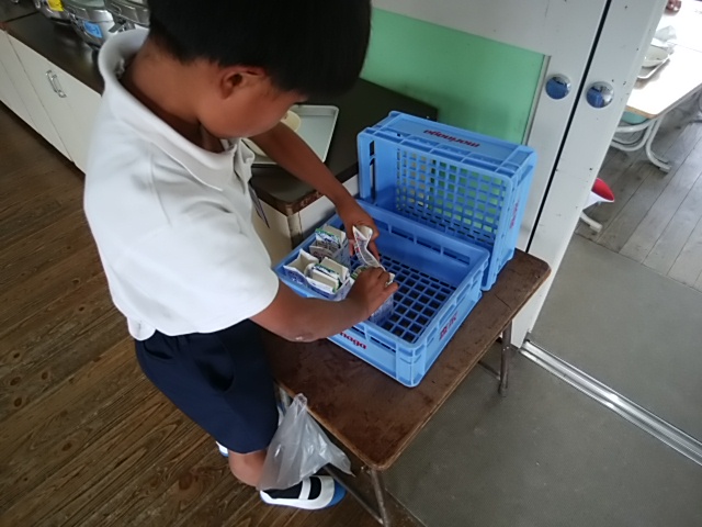 6月12日(月)1年生もすっかり給食になれ、牛乳パックの片付けも一つにまとめてかさが減るようにしています。