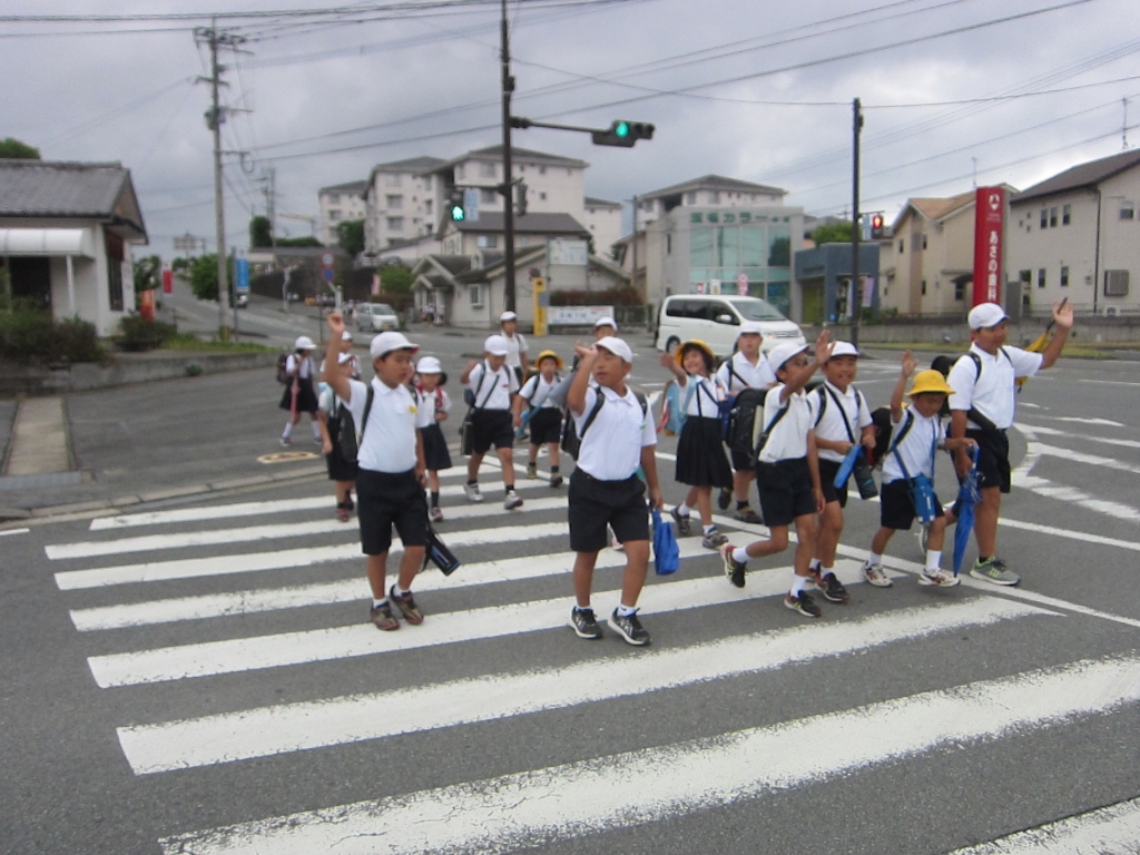 6月8日(木)朝の登校の様子です。横断歩道を一列ですばやく渡っています。