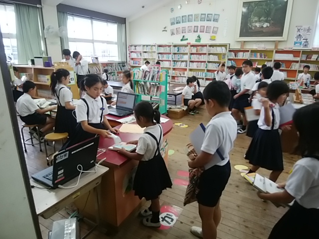 6月7日(水)朝から雨が降っていて、図書室に来る子どもがたくさんいました。図書委員が貸し出しをがんばっていました。