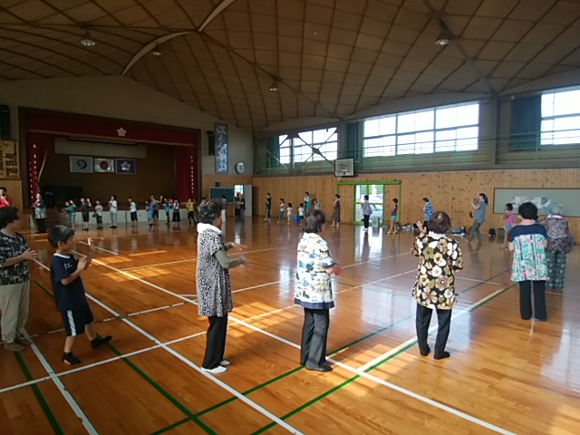 7月28日(金)夏祭りに向けて、盆踊りの練習がありました。校区のお年寄りも参加されています。