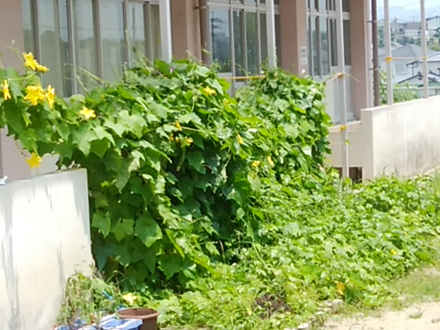 7月28日(金)理科園のヘチマやアサガオがぐんぐん伸びています。観察用なので上に伸びないようにしています。