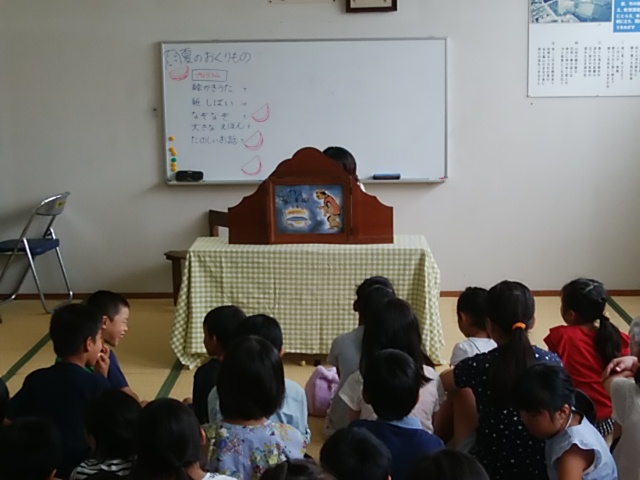 7月24日(月)夏休みです。朝からお話の会の読み聞かせがありました。50人以上の子どもが集まりました。