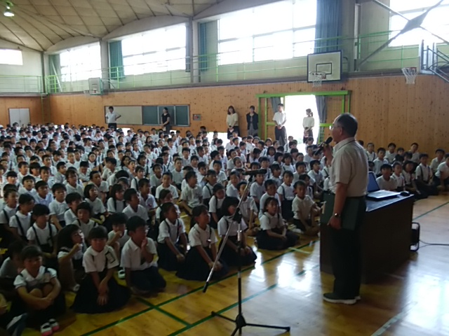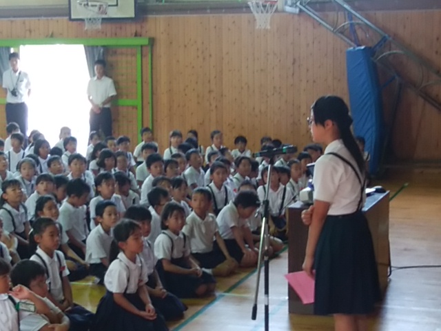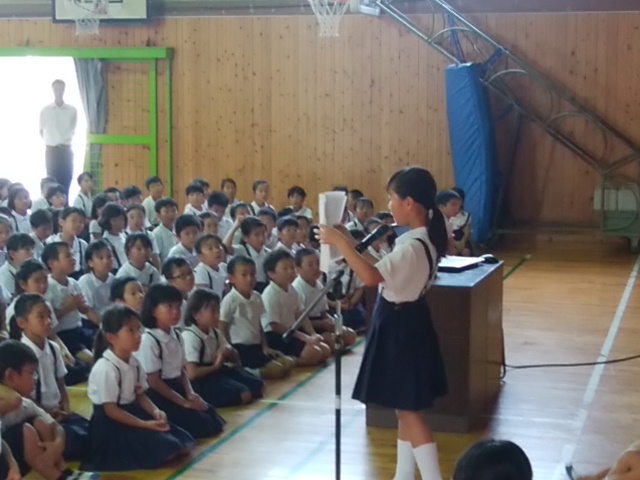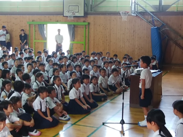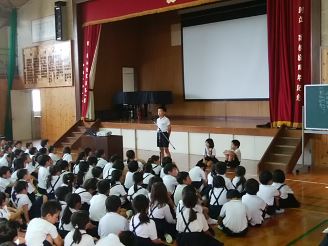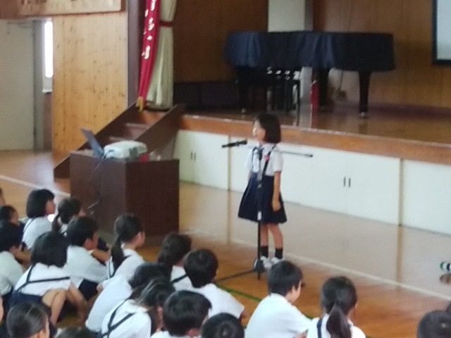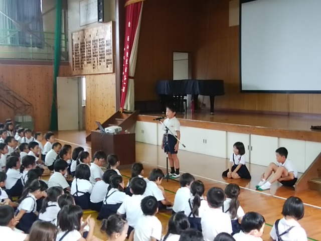 7月21日(金)朝から全校集会がありました。校長先生のお話、夏休みの生活について、児童発表、童話発表がありました。