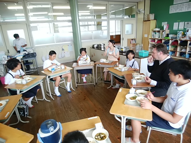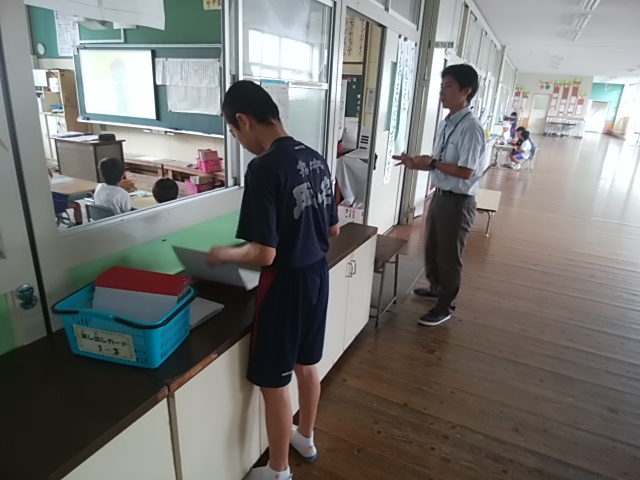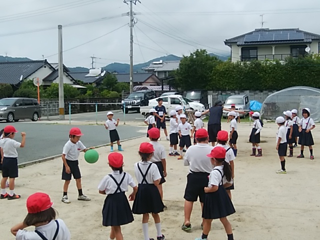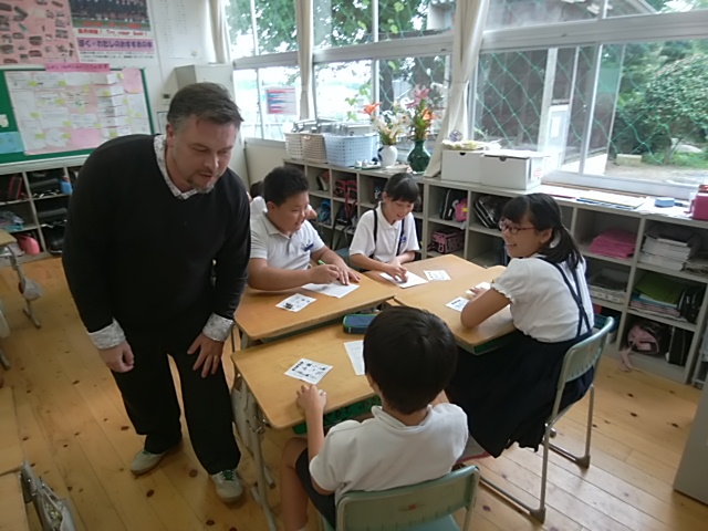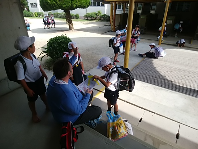 7月14日(金)ALTのジェイムス先生が来られて授業をされました。帰りも一人一人の子どもにあいさつをされていました。