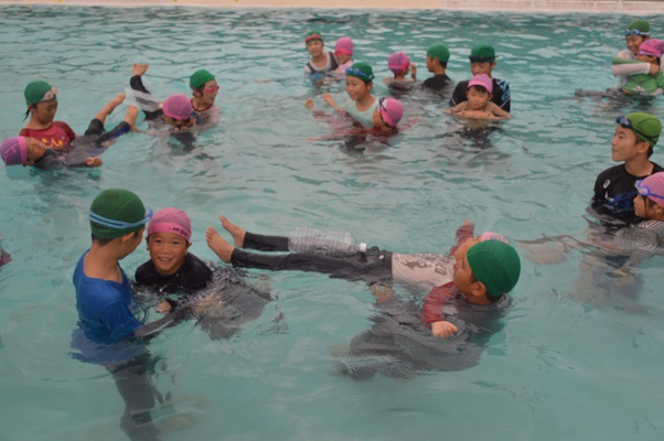 7月19日(水)1年生と6年生が着衣水泳をしました。命を守るために必要です。