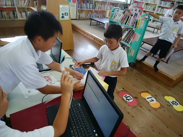 ◆昼休みの図書室、図書委員が本の貸し出しをがんばっていました。