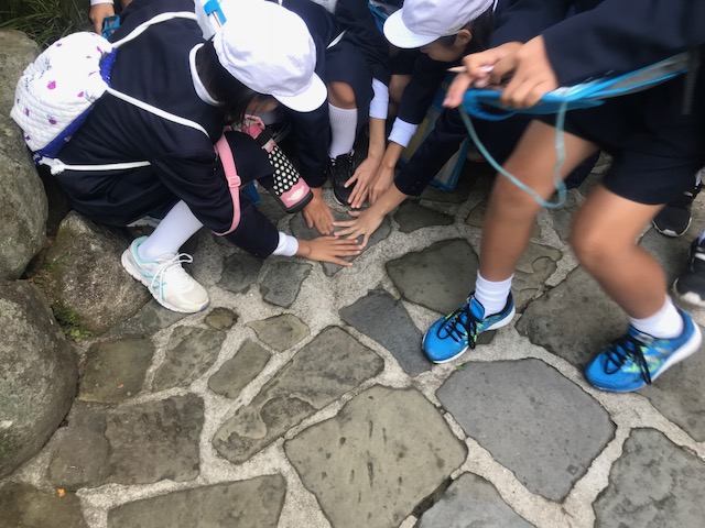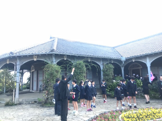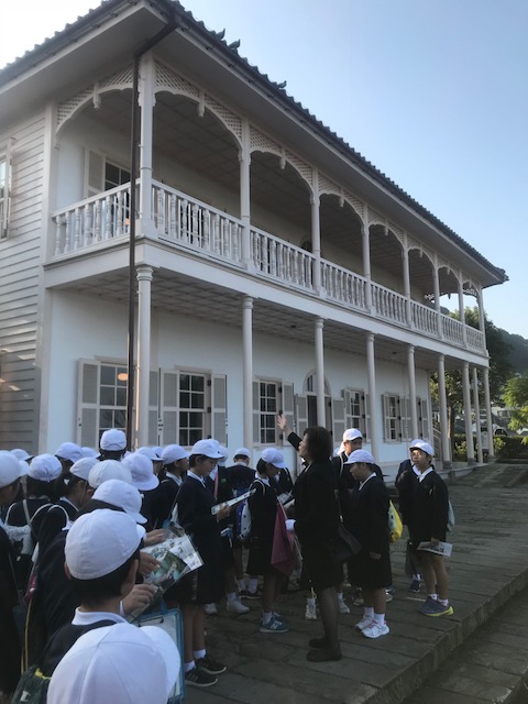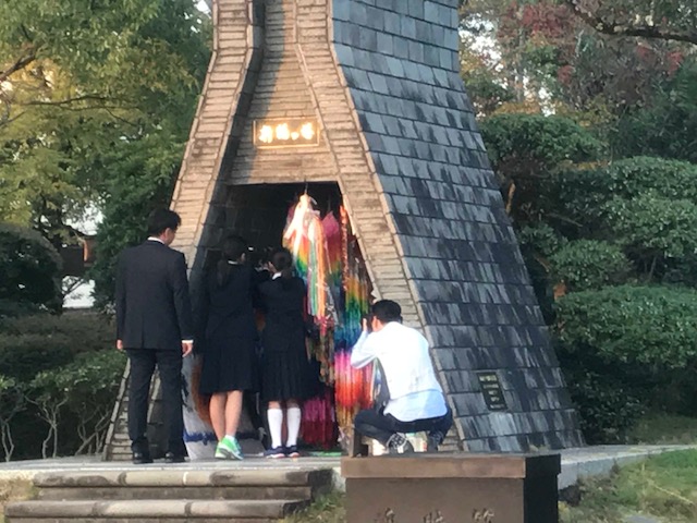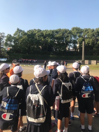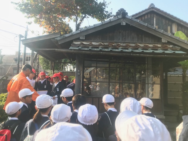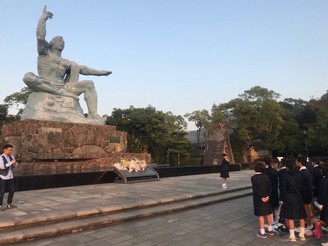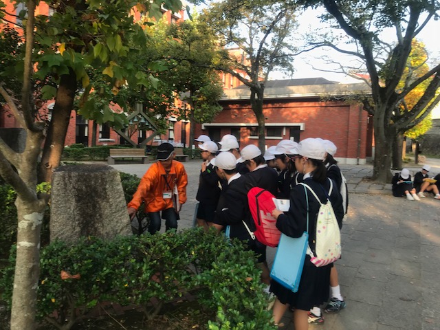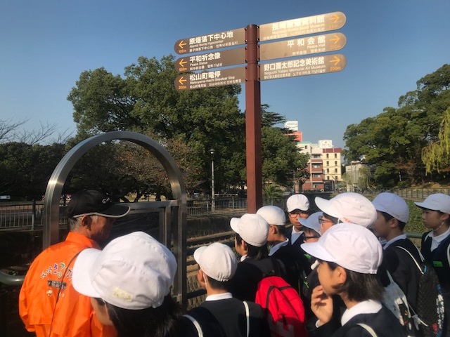 <フィールドワーク>グループ毎にボランティアガイドさんについて、如己堂や爆心地などで学習していました。